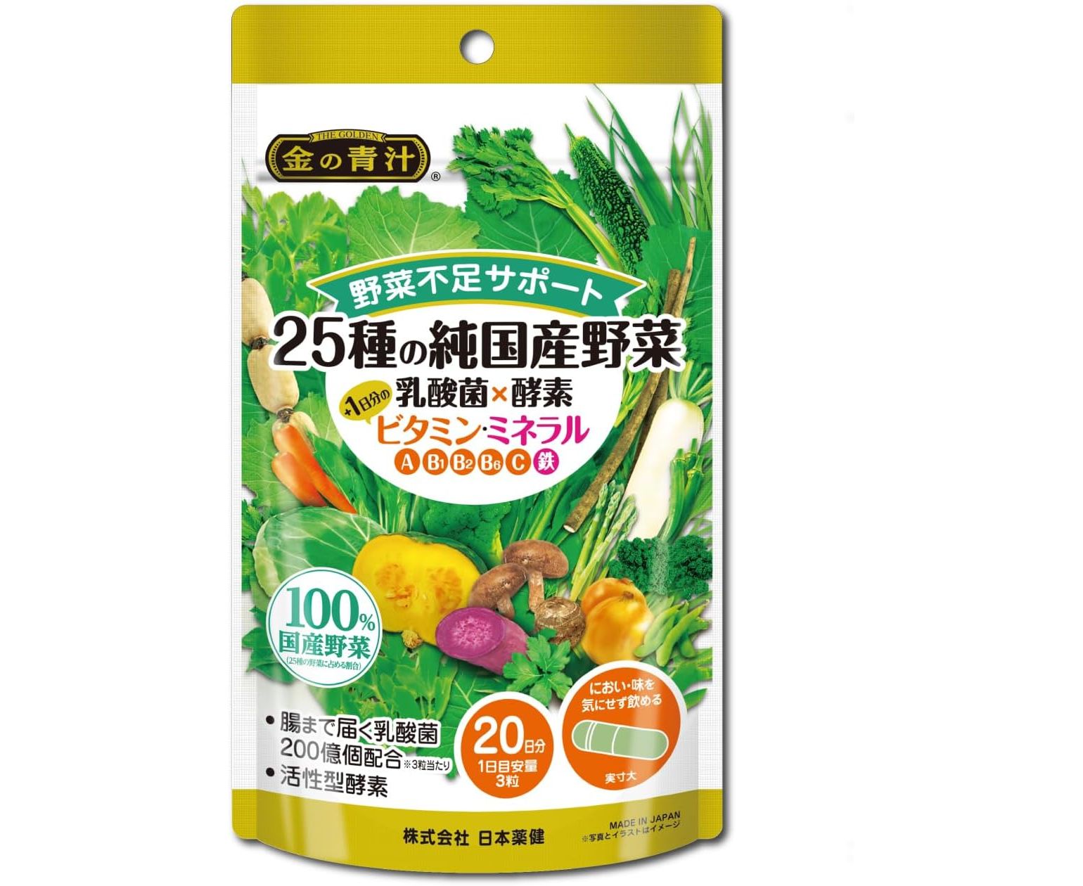 В состав входит порошок травы ячменя (производства Япония), продукт разложения крахмала, порошок спирулины, порошок стерилизованных молочнокислых бактерий (содержит молочные ингредиенты), экстракт папайи, растительный порошок (бамия, кочанная капуста, капуста кудрявая, морковь, тыква, лопух, батат, таро, шиитаке, брокколи, ашитаба, спаржа, эдамаме (включая соевые бобы), комацуна, сельдерей, редис, лист редиса, лук, петрушка, шпинат, лимон, корень лотоса, порошок листьев шелковицы, порошок горькой дыни, порошок капусты, порошок молохейи, порошок пуговицы бофу (долгоживущая трава)), HPMC, витамин C (100 мг.), целлюлоза, пирофосфат железа (6,8 мг.), стеарат кальция, диоксид кремния, витамин B1 (1,2-3,5 мг.), витамин B6 (1,6 мг.), витамин A, витамин B2 (1,4 мг.), витамин А (770-1925 мкг.) Не содержит красителей и ароматизаторов.