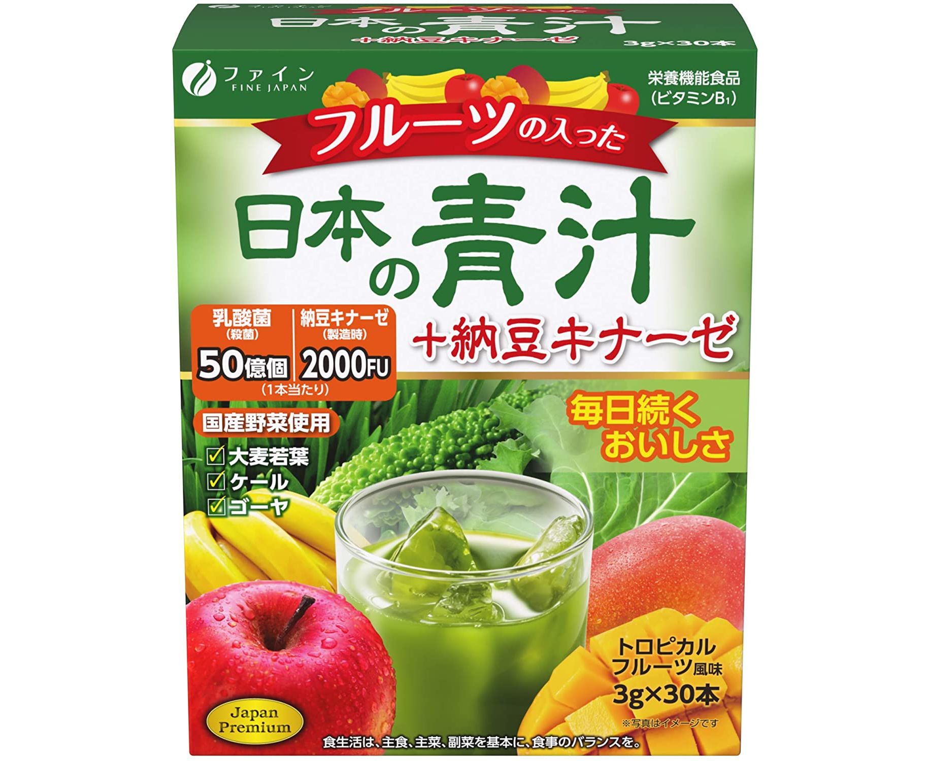 Аодзиру FINE JAPAN Aojiru & Nattokinase & Lactic Acid Bacteria содержит натуральные компоненты, которые оказывают комплексное действие на организм.