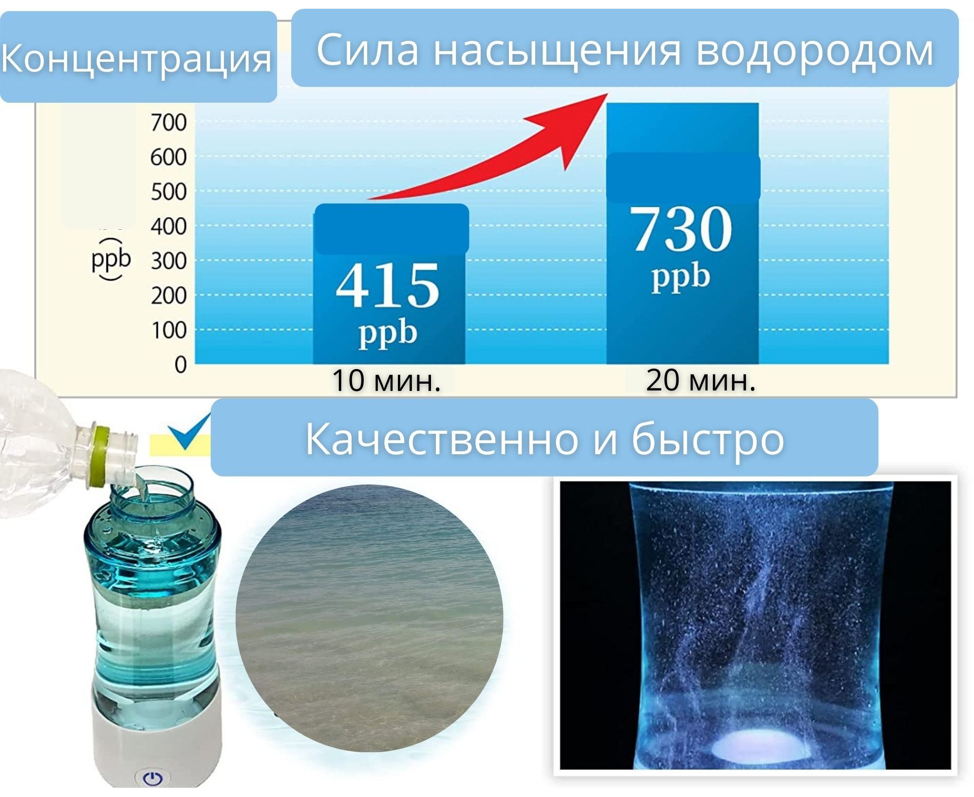 - насыщение водородом происходит за 10 минут до 415 ppb и до 730 ppb за 20 минут;