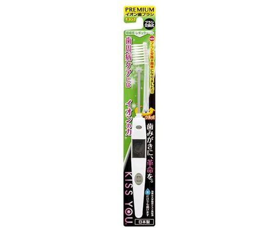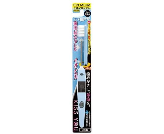 KISS YOU Extra Fine Slim – ионная зубная щетка с узкой головкой и ультра-тонкими щетинками. Внутри нее располагается маленькая батарейка, генерирующая поток отрицательно заряженных ионов, и металлический стержень, проводящий ионы до щетинок. Такую зубную щетку разрешено использовать даже детям.