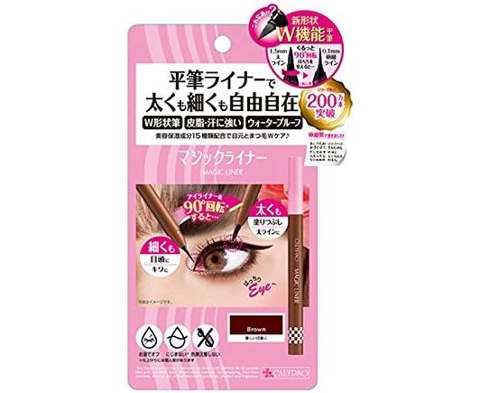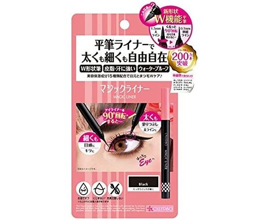 Magic Liner — подводка-фломастер с интуитивной регулировкой толщины линии от японского бренда CALYPSO. Она содержит в себе 15 ухаживающих компонентов, не раздражает глаза и совершенно не смазывается. Пользоваться такой подводкой довольно легко. Она может нарисовать как тонкую, так и более широкую линию. Регулировка толщины линии происходит всего лишь при одном вращении корпуса на 90 градусов. Не содержит спирта и парабенов. Имеет 2 оттенка: черный и коричневый.