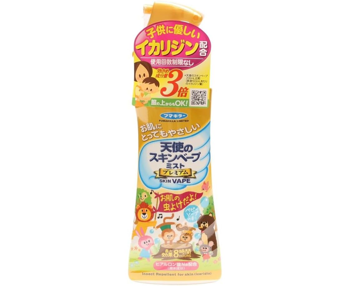 Skin Vape – спрей от комаров и других насекомых для взрослых и детей старше 6 месяцев от известного японского производителя Fumakilla. Средство имеет водную основу, поэтому оно нежно воздействует на кожный покров. В его состав не входят аллергены и вредные добавки. Спрей имеет приятный цитрусово-морской аромат, хорошо впитывается и не оставляет после себя следов или липкой пленки. Одно распыление отпугивает насекомых примерно на 4 часа.