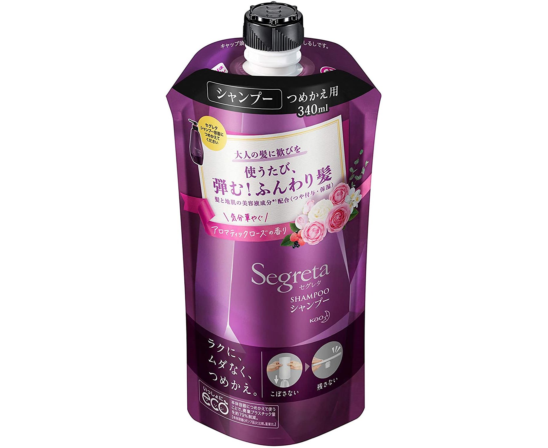 KAO Segreta Shampoo – увлажняющий антивозрастной шампунь для волос. Он содержит в своем составе запатентованный производителем компонент Quartamin, который предназначен для решения проблемы потери объема, гладкости и блеска волос после 35-40 лет. Средство имеет приятный аромат розы.