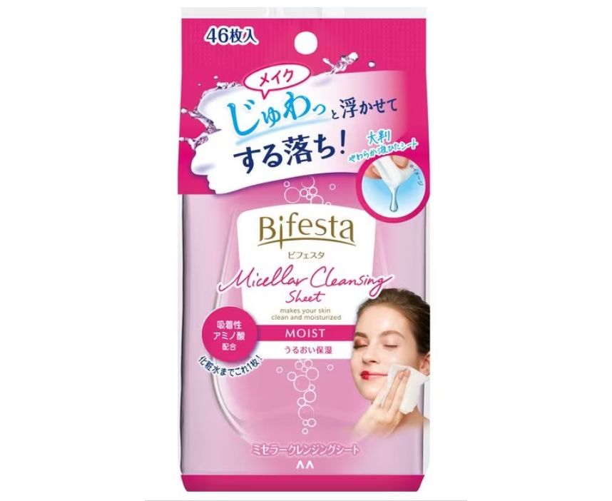 Micellar cleansing sheets MOIST – влажные салфетки с аминокислотами для удаления макияжа от японского бренда Mandom линия BIFESTA. Они бережно удаляют с кожи лица и области глаз самый водостойкий макияж, не вызывая при этом совершенно никакого дискомфорта или раздражения. Средство за мгновение справится с любым видом туши, подводки, а также карандаша для глаз. Кроме этого пропитка салфеток увлажняет, а также ухаживает за кожей.
